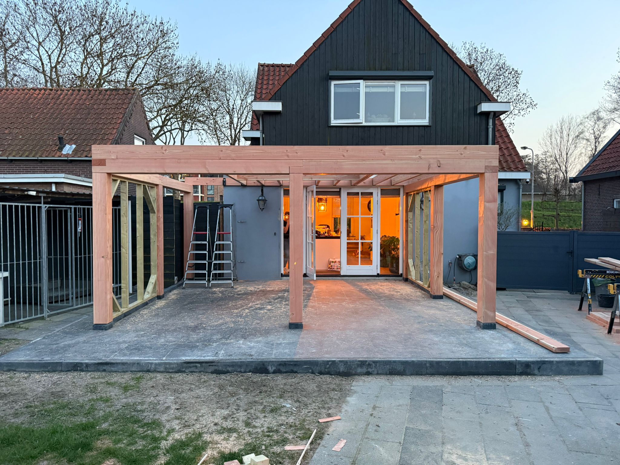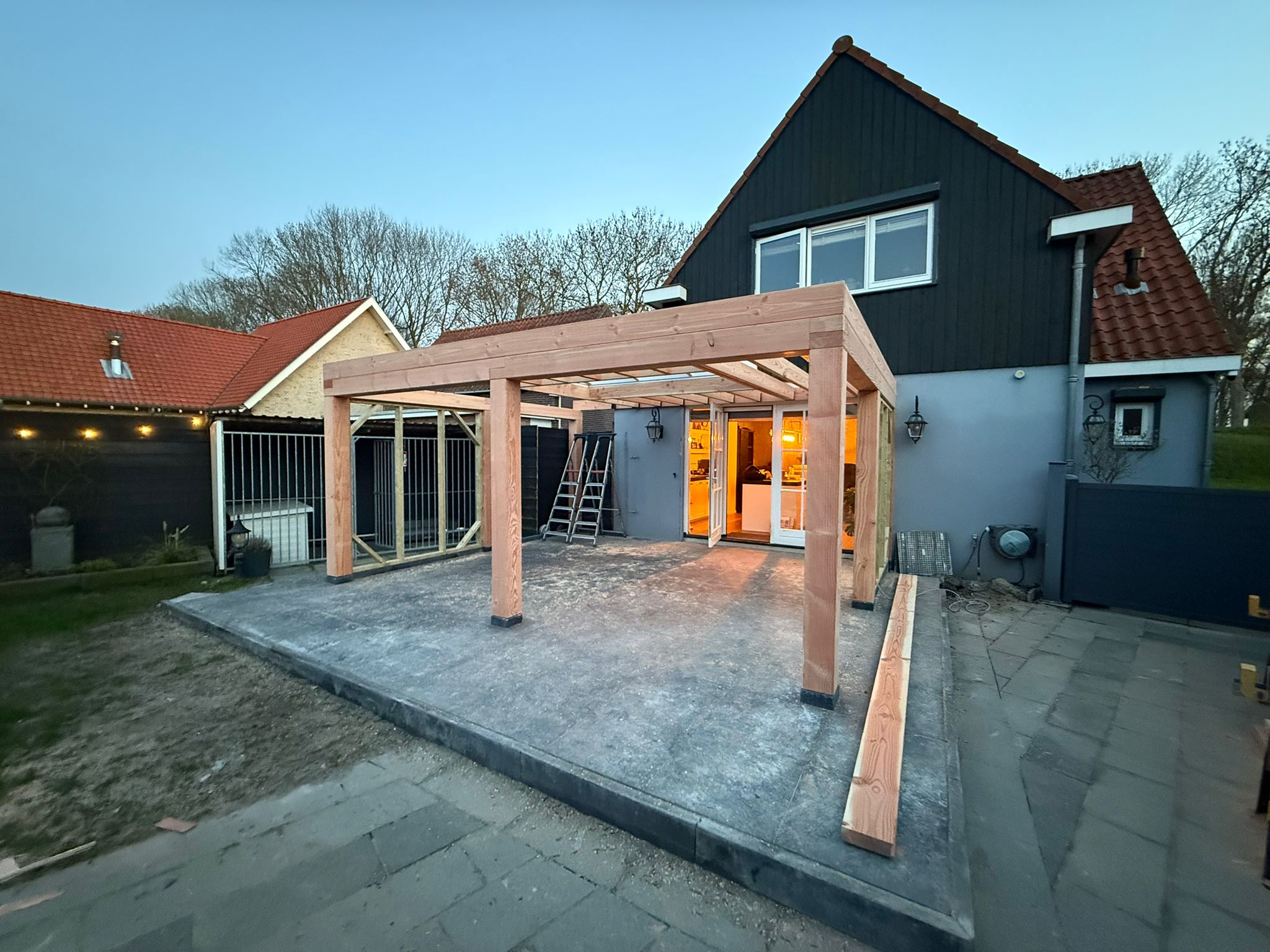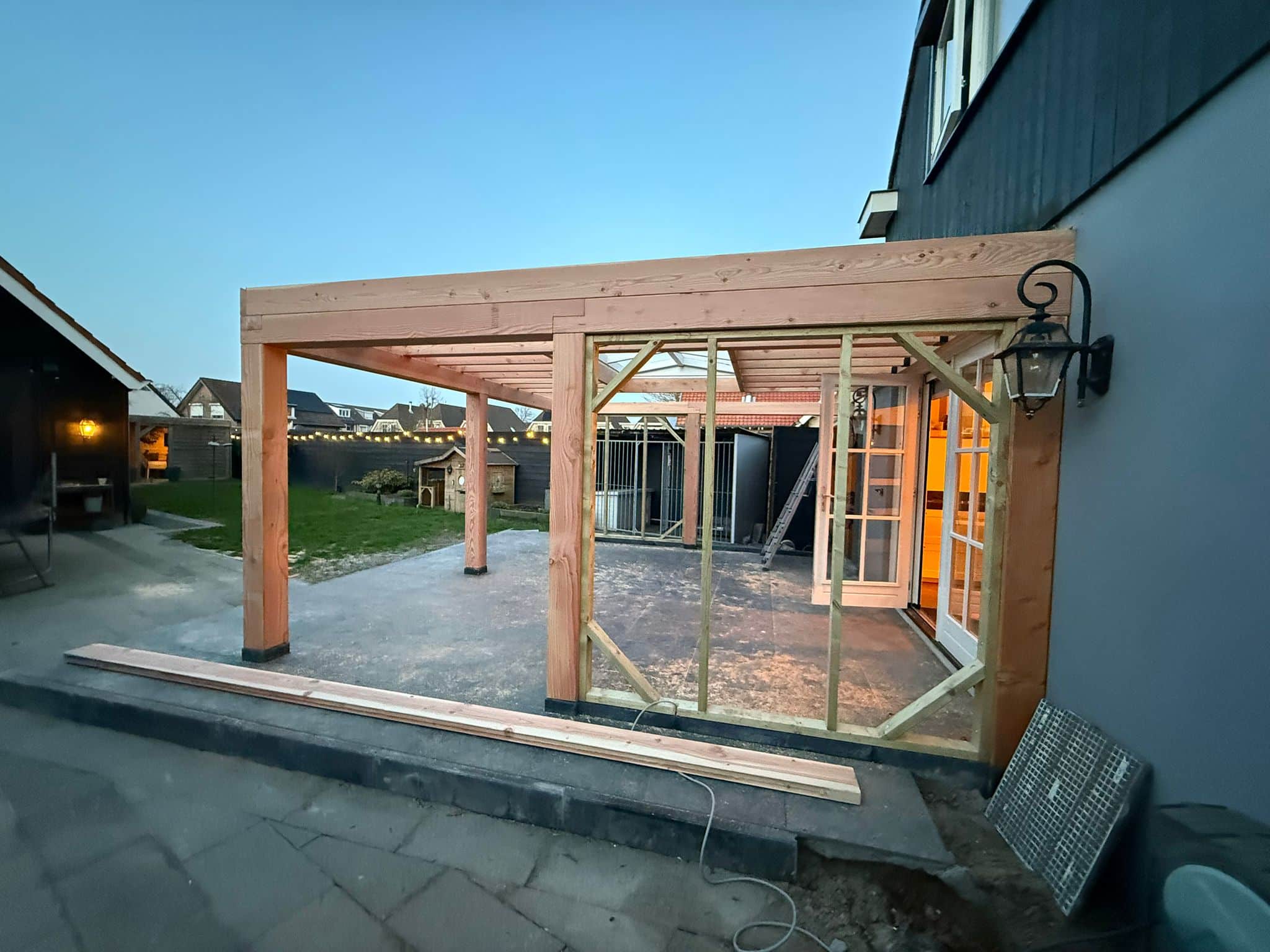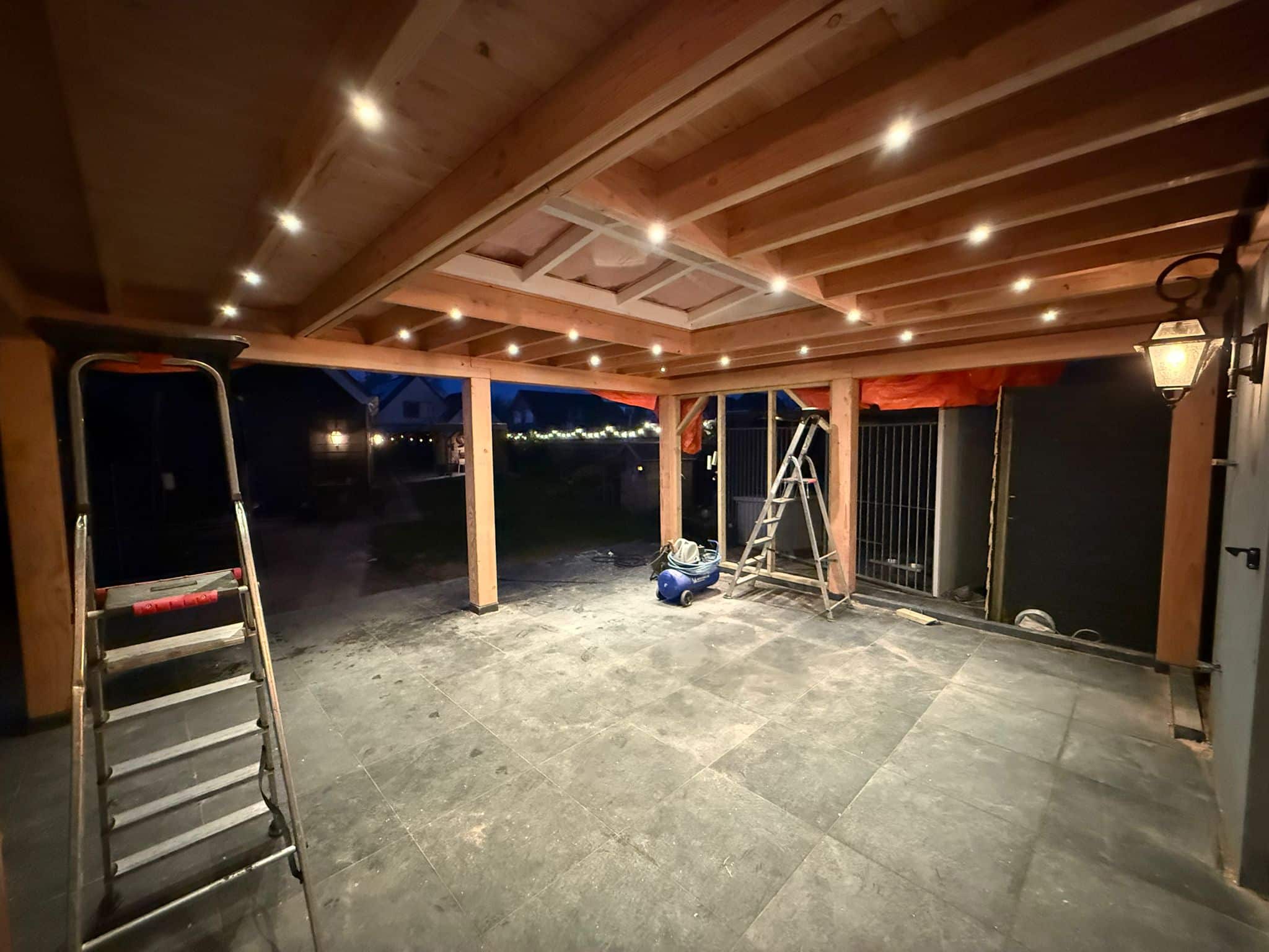 Voor deze woning is een buitenverblijf gerealiseerd dat direct aansluit op de bestaande gevel. Het project is van begin tot eind verzorgd, van het voorbereiden van de ondergrond en het plaatsen van poeren tot de aanleg van bestrating, constructie, elektra en de afwerking van het dak met PVC dakbedekking. Op basis van een eerste schets van de opdrachtgever is in het voortraject actief meegedacht over de indeling, constructie en uitvoering, zodat alle onderdelen goed op elkaar aansluiten.